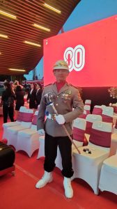 IPDA Ferdinand Tumiwa, Kanit Turjawali berpangkat 1 balak ini tampil gagah memimpin pasukan paskibraka sebagai Komandan Upacara. Dengan langkah tegas dan penuh wibawa, ia mengawal jalannya prosesi penurunan bendera hingga selesai dengan tertib dan lancar.