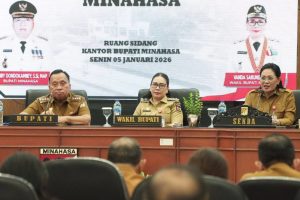 RadiusNews.id, Minahasa- Bupati Minahasa Robby Dondokambey, SSi, MAP., didampingi Wakil Bupati Minahasa Vanda Sarundajang SS, serta Sekretaris Daerah Kabupaten Dr. Lynda D. Watania, MM, MSi, memimpin Rapat Kerja Pemerintah Kabupaten Minahasa Tahun 2026. Kegiatan tersebut dilaksanakan di Ruang Sidang Kantor Bupati Minahasa, Senin (5/12/2025).