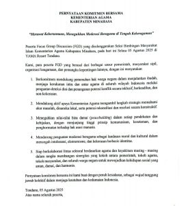RadiusNews.id, Minahasa- Kemenag Minahasa usai menggelar FGD Penguatan Deteksi Dini Konflik Sosial Berdimensi Keagamaan yang digelar di hotel Yama Resort Tondano, Selasa (5/7/25) yang dihadiri unsur perwakilan organisasi keagamaan, menyatakan sikap dalam forum resmi ini yaitu pernyataan komitmen bersama Kementerian Agama Kabupaten Minahasa dalam merawat kebersamaan,meneguhkan moderasi beragama di tengah keberagamaan.